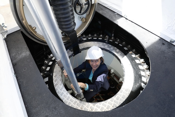 Emmanuel Macron w kasku na nowym okrecie podwodnym Suffren w Cherbourg