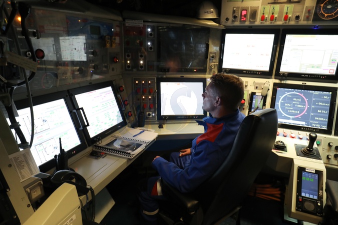 Emmanuel Macron w kasku na nowym okrecie podwodnym Suffren w Cherbourg