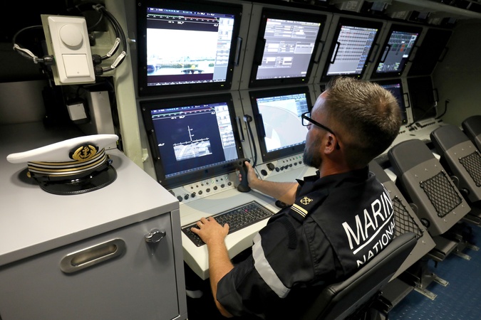 Emmanuel Macron w kasku na nowym okrecie podwodnym Suffren w Cherbourg