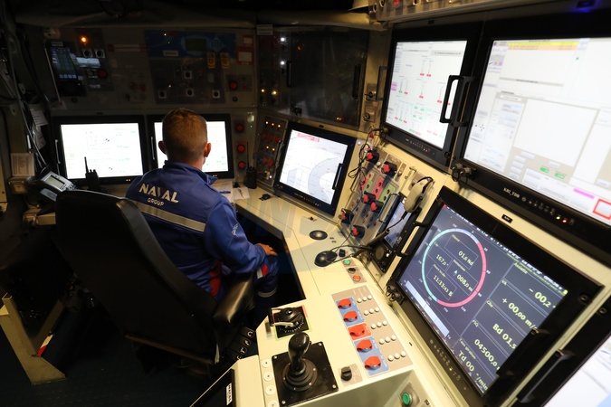 Emmanuel Macron w kasku na nowym okrecie podwodnym Suffren w Cherbourg