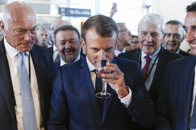 Emmanuel Macron wacha wino - seria zdjec z kieliszkiem
