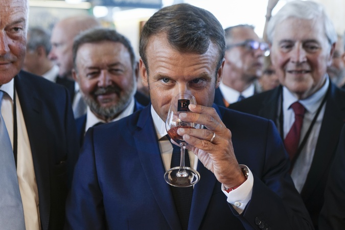 Emmanuel Macron wacha wino - seria zdjec z kieliszkiem