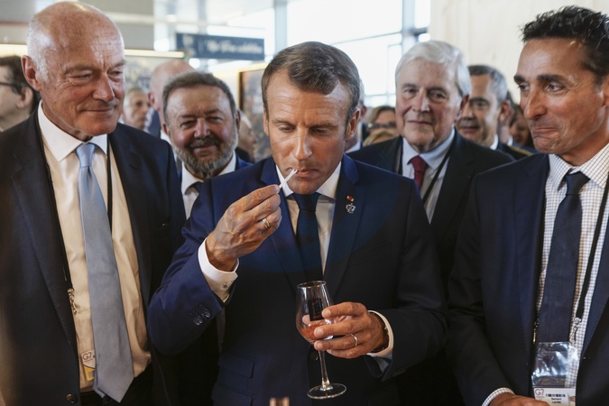Emmanuel Macron wacha wino - seria zdjec z kieliszkiem