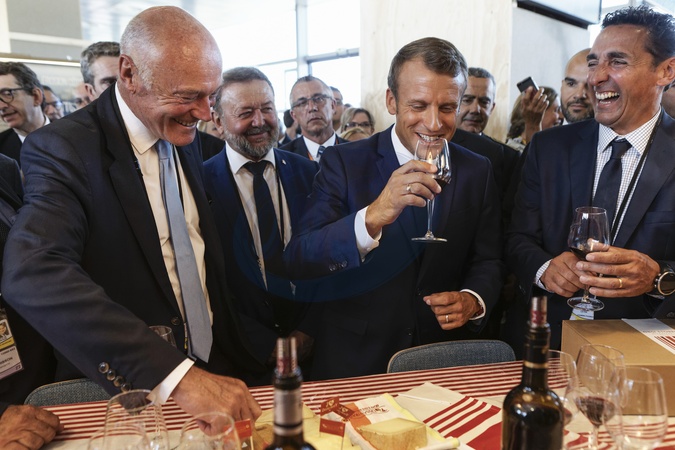 Emmanuel Macron wacha wino - seria zdjec z kieliszkiem