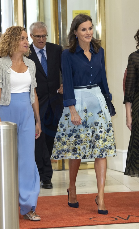 Krolowa Letizia w kwiecistej spodniczce i granatowej koszuli