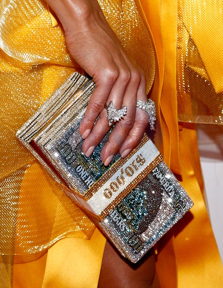 Jennifer Lopez w zoltej sukni i z torebka jak plik dolarow na Festiwalu w Toronto