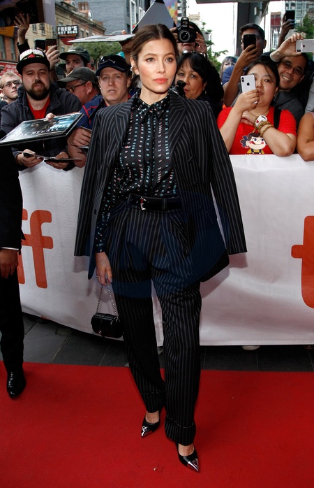 Jessica Biel w garniturze w prazki na Festiwalu w Wenecji