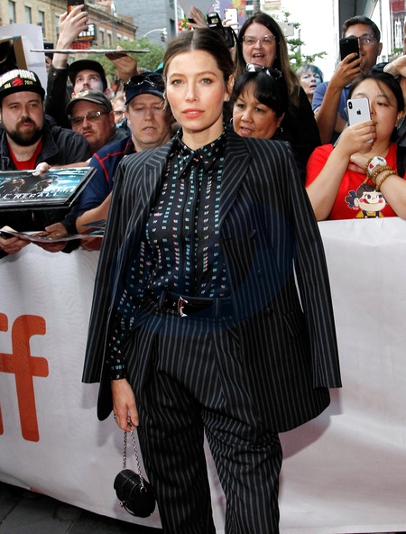Jessica Biel w garniturze w prazki na Festiwalu w Wenecji