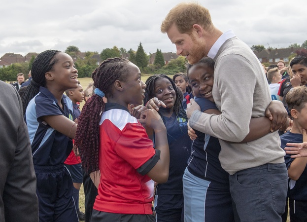 Ksiaze Harry z guzem na czole podczas wizyty Rugby Football Union (RFU) All Schools programme