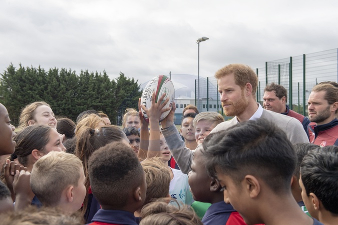 Ksiaze Harry z guzem na czole podczas wizyty Rugby Football Union (RFU) All Schools programme