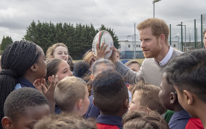 Ksiaze Harry z guzem na czole podczas wizyty Rugby Football Union (RFU) All Schools programme