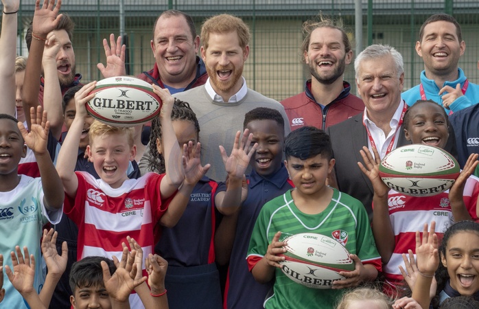 Ksiaze Harry z guzem na czole podczas wizyty Rugby Football Union (RFU) All Schools programme
