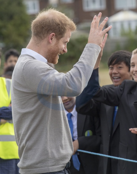 Ksiaze Harry z guzem na czole podczas wizyty Rugby Football Union (RFU) All Schools programme