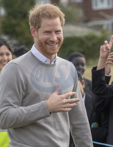 Ksiaze Harry z guzem na czole podczas wizyty Rugby Football Union (RFU) All Schools programme