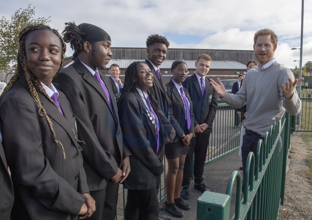 Ksiaze Harry z guzem na czole podczas wizyty Rugby Football Union (RFU) All Schools programme