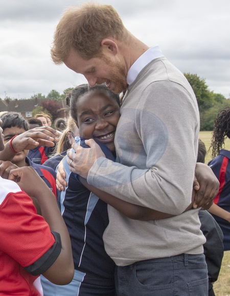 Ksiaze Harry z guzem na czole podczas wizyty Rugby Football Union (RFU) All Schools programme