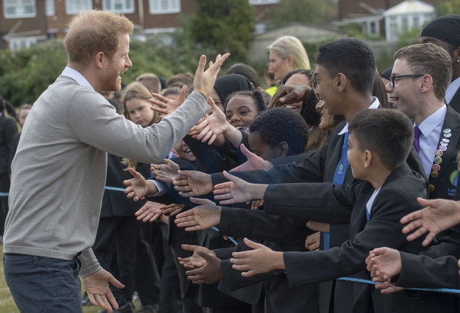 Ksiaze Harry z guzem na czole podczas wizyty Rugby Football Union (RFU) All Schools programme