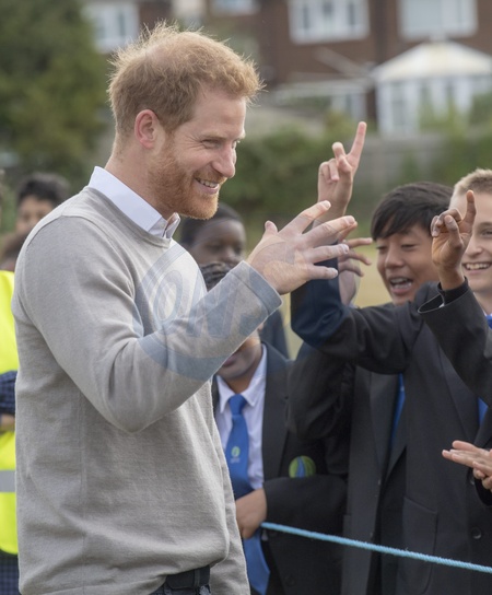 Ksiaze Harry z guzem na czole podczas wizyty Rugby Football Union (RFU) All Schools programme