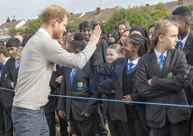 Ksiaze Harry z guzem na czole podczas wizyty Rugby Football Union (RFU) All Schools programme