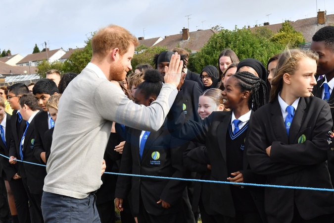 Ksiaze Harry z guzem na czole podczas wizyty Rugby Football Union (RFU) All Schools programme