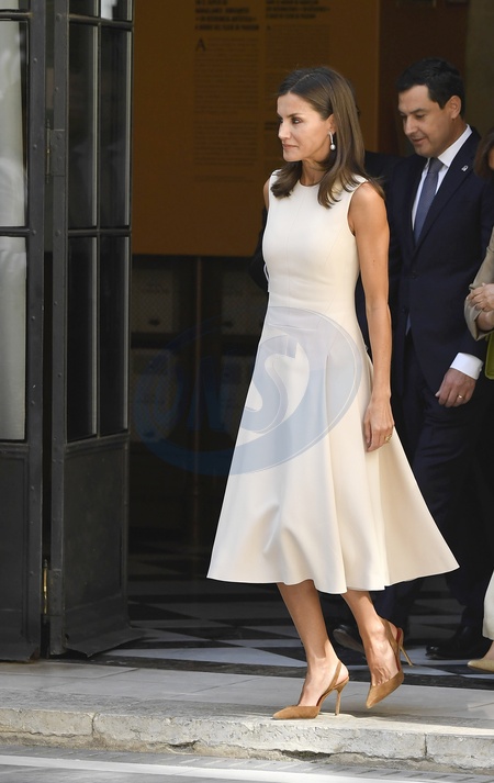 Krolowa Letizia w sukience ecru i krol Filip na wystawie The Longest Journey