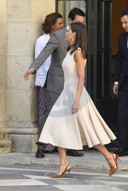 Krolowa Letizia w sukience ecru i krol Filip na wystawie The Longest Journey