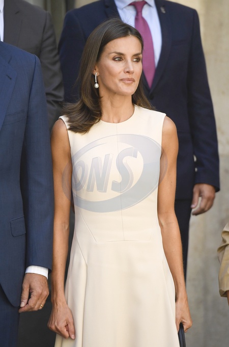 Krolowa Letizia w sukience ecru i krol Filip na wystawie The Longest Journey