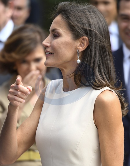 Krolowa Letizia w sukience ecru i krol Filip na wystawie The Longest Journey