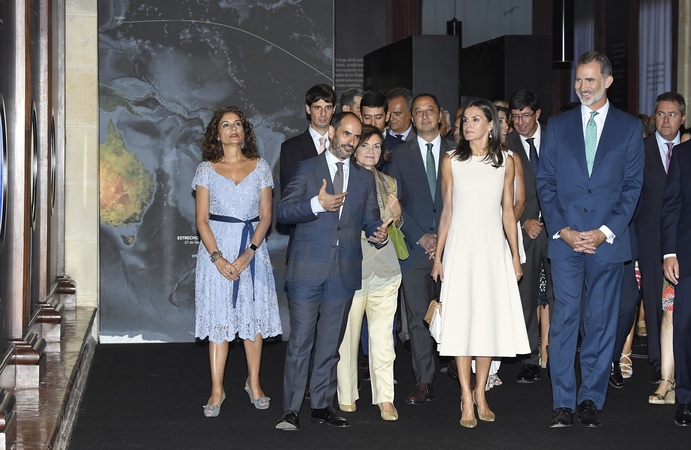 Krolowa Letizia w sukience ecru i krol Filip na wystawie The Longest Journey