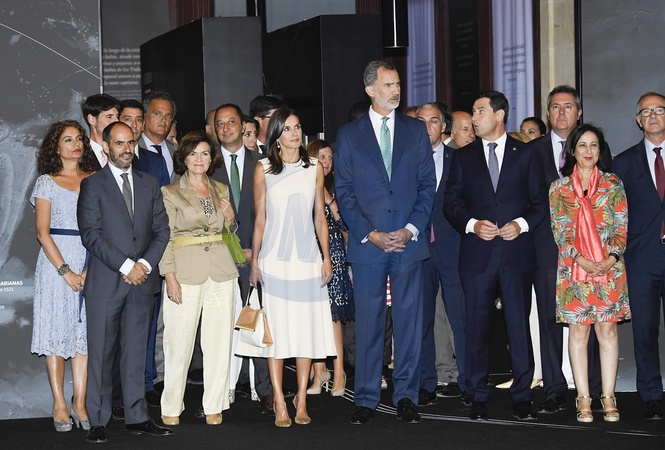 Krolowa Letizia w sukience ecru i krol Filip na wystawie The Longest Journey