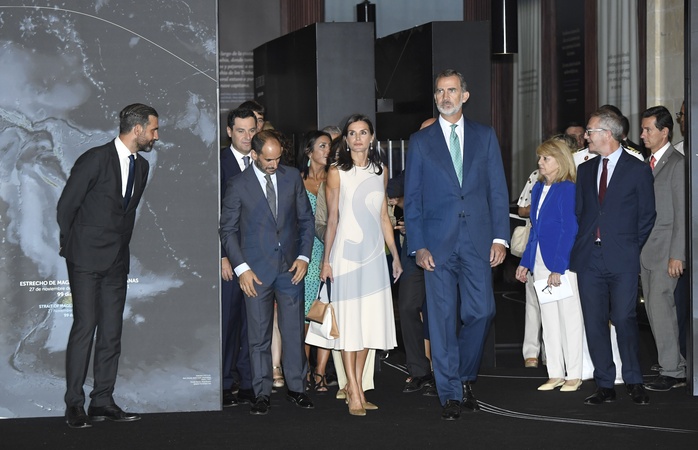 Krolowa Letizia w sukience ecru i krol Filip na wystawie The Longest Journey