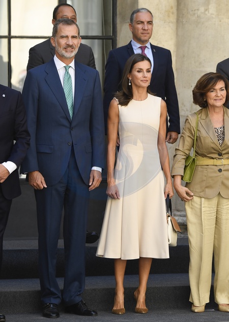 Krolowa Letizia w sukience ecru i krol Filip na wystawie The Longest Journey