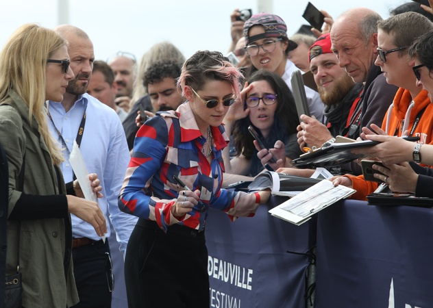 Kristen Stewart w kolorowej koszuli i w rozowej grzywce na festiwalu w Deauville