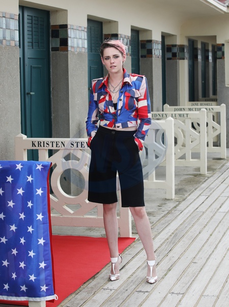 Kristen Stewart w kolorowej koszuli i w rozowej grzywce na festiwalu w Deauville
