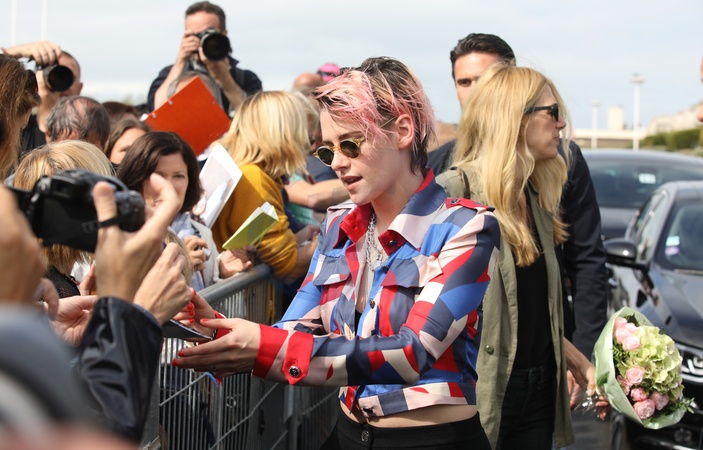 Kristen Stewart w kolorowej koszuli i w rozowej grzywce na festiwalu w Deauville