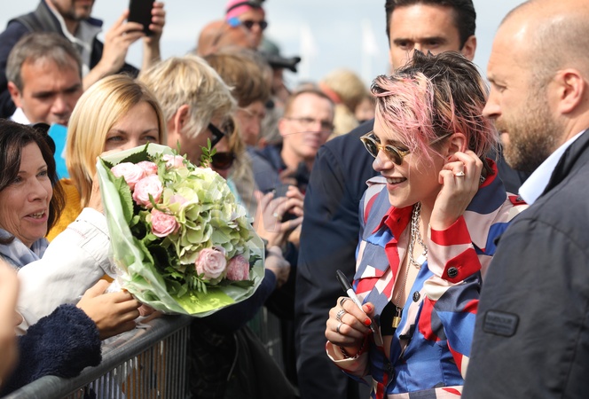 Kristen Stewart w kolorowej koszuli i w rozowej grzywce na festiwalu w Deauville