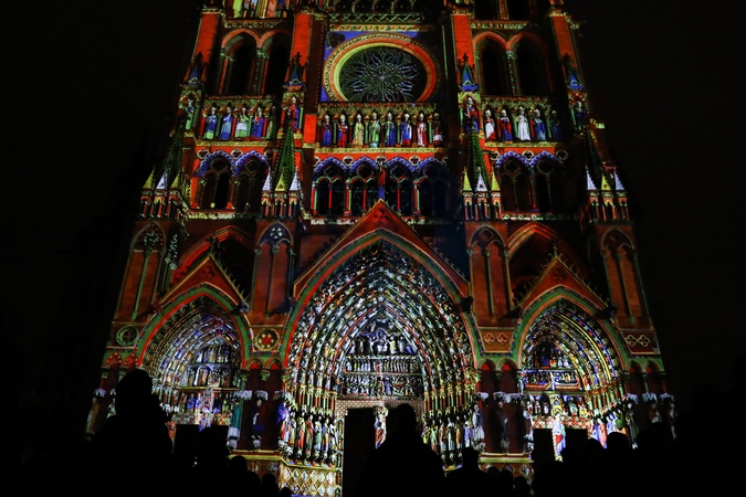 Macronowie ogladaja spektakl swiatla na katedrze w Amiens