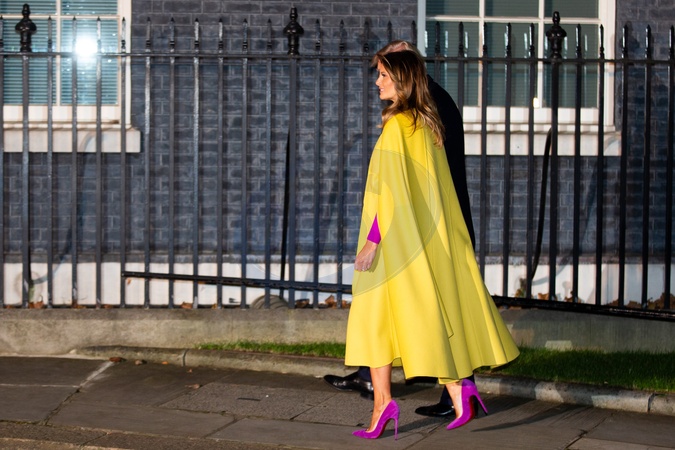 Melania Trump w zoltej kreacji i w fioletowych szpilkach na przyjeciu w Londynie