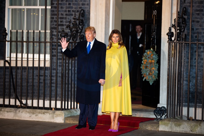 Melania Trump w zoltej kreacji i w fioletowych szpilkach na przyjeciu w Londynie