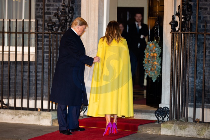 Melania Trump w zoltej kreacji i w fioletowych szpilkach na przyjeciu w Londynie