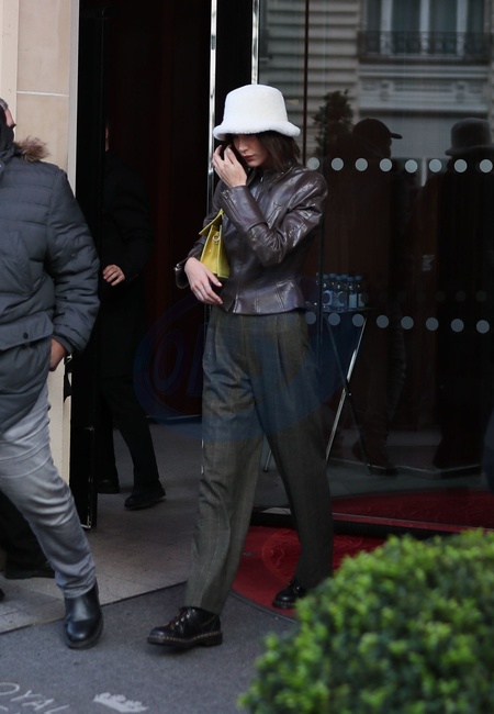 Bella Hadid w bialym kapelusiku na fashion week w Paryzu