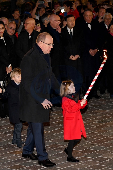 Ksiaze Albert i Charlene z dziecmi podczas ceremonii Sainte Devote