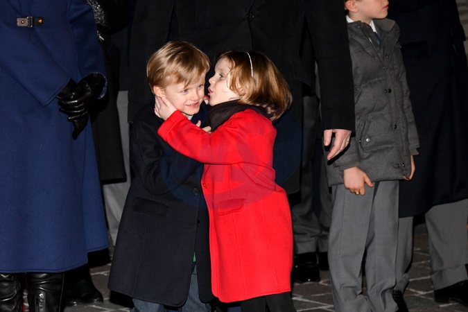 Ksiaze Albert i Charlene z dziecmi podczas ceremonii Sainte Devote