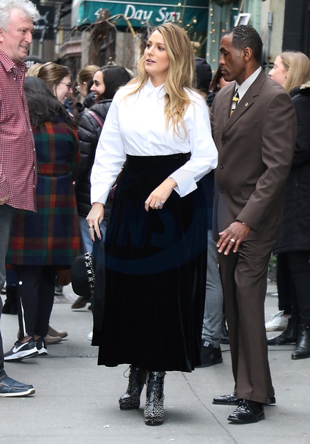 Blake Lively na galowo - biala koszula i czarna spodnica