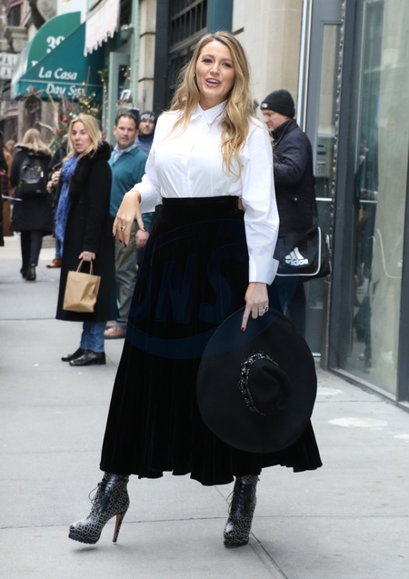 Blake Lively na galowo - biala koszula i czarna spodnica
