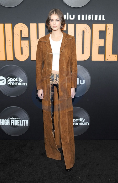 Kaia Gerber w plaszczu do samej ziemi na premierze High Fidelity