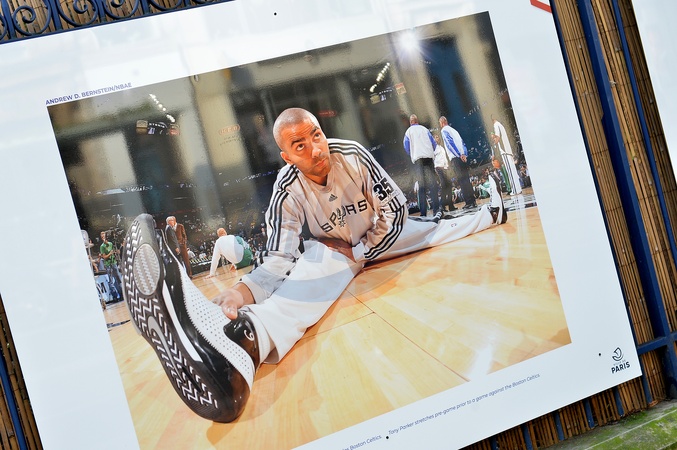 Tony Parker oglada wystawe zdjec o swojej karierze
