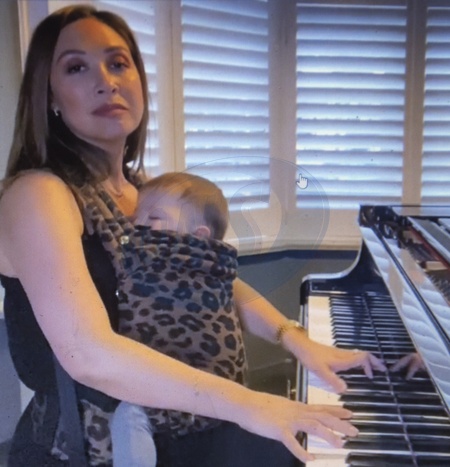 Myleen Klass z dzieckiem w chuscie gra na pianinie