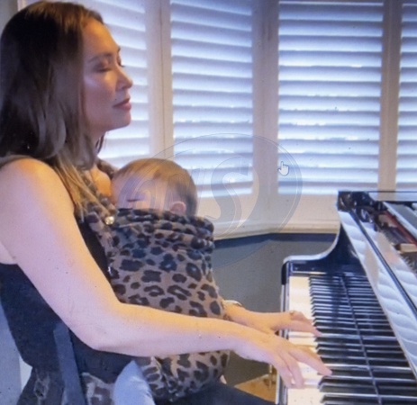 Myleen Klass z dzieckiem w chuscie gra na pianinie
