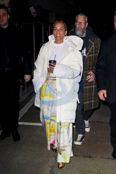 Alicia Keys w bialej, puchowej kurtce i w kolorowych spodniach wraca z NRJ Radio